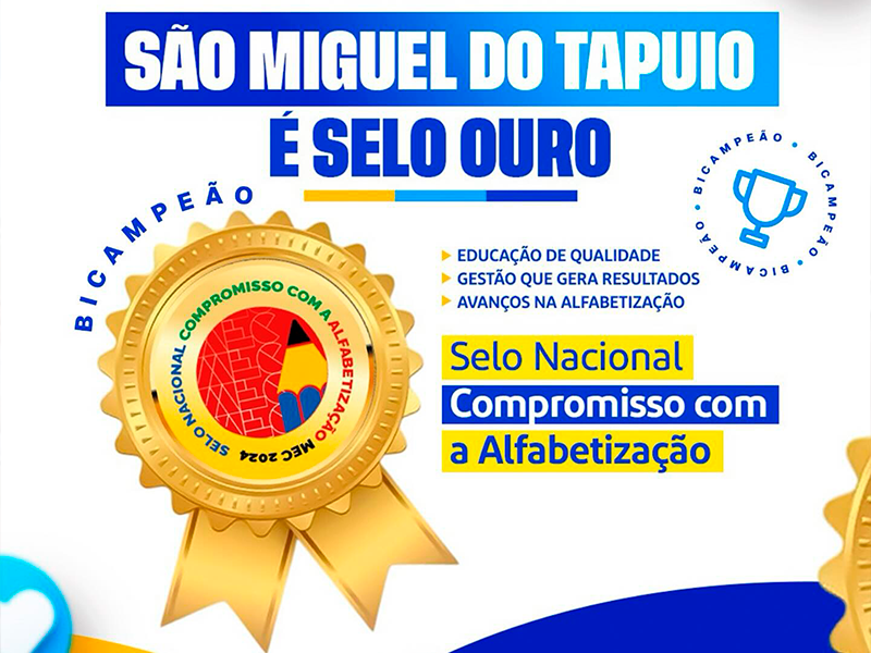 São Miguel do Tapuio é bicampeão no Compromisso Nacional Criança Alfabetizada, alcançando o índice da meta nacional de crianças alfabetizadas e conquistando novamente o Selo Ouro. Esse resultado reforça o avanço real da educação no município e o compromisso contínuo com o desenvolvimento das nossas crianças desde os primeiros anos escolares.