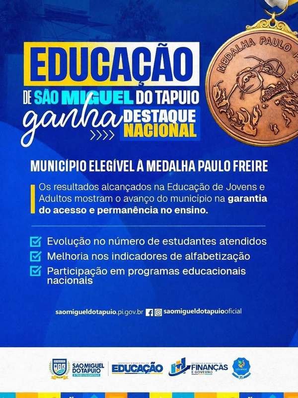 São Miguel do Tapuio celebra um importante reconhecimento, o município se torna elegível à Medalha Paulo Freire, resultado dos avanços na Educação de Jovens e Adultos.