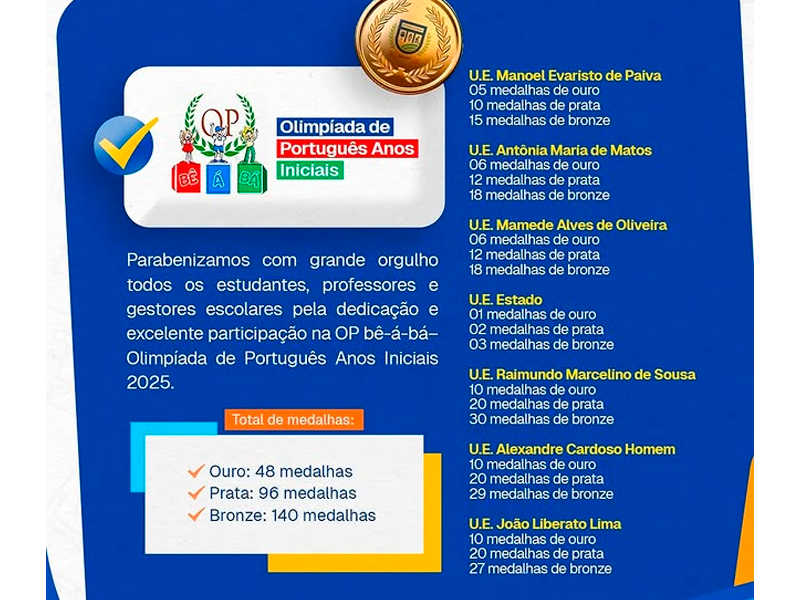 Com imenso orgulho, celebramos a brilhante participação dos nossos estudantes na Olimpíada de Português - Anos Iniciais 2025. Foram 284 medalhas, resultado do empenho diário dos estudantes, da dedicação dos professores e do compromisso dos gestores escolares.